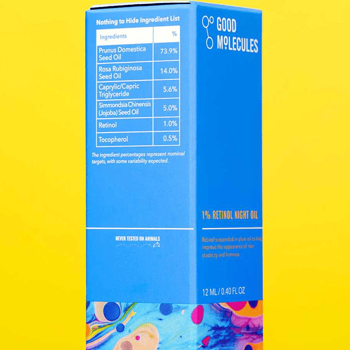 Ayuda a suavizar, reafirmar y refinar el aspecto de la piel para lograr una apariencia más juvenil con el aceite de noche con 1 % de retinol de Good Molecules. Este tratamiento hidratante, potenciado con un 1 % de retinol potente en una base de aceite de ciruela nutritivo, ayuda a reducir la aparición de líneas finas, arrugas, falta de elasticidad y tono de piel desigual.